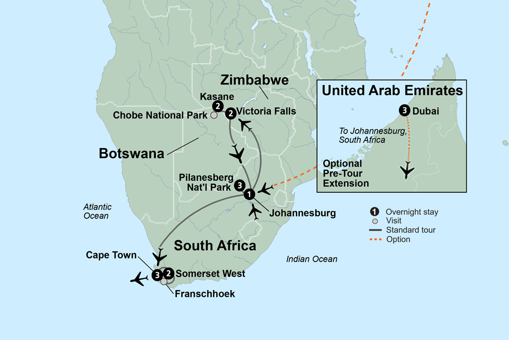 You’re on your way to southern Africa, where incredible landscapes lead the way to a blend of cultural diversity, an abundance of wildlife, and a remarkable history. From urban centers to wild safaris, Africa takes you by surprise, delighting you again and again until its unique spirit claims you, heart and soul.